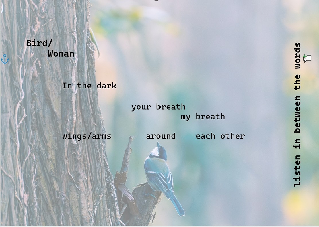 "The image (from one of the prompts) of someone buried with a bird in their mouth suggested to me a certain kind of intimacy, which became the starting point for this score. In it, I tentatively reference imaginary listening; bird/human transformations (I thought of the movie ‘Howls Moving Castle’); dan-mei literature in particular when centered on shapeshifting entities, changing from human to animal and back; relations with Donna Haraway’s more-than-human kin. All, I imagine, accessed through a queer listening – a listening beyond, underneath and past the heteronormative din of the everyday."